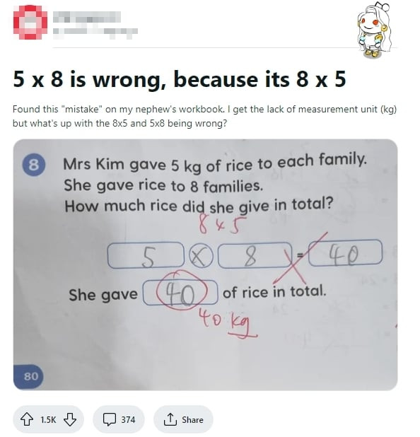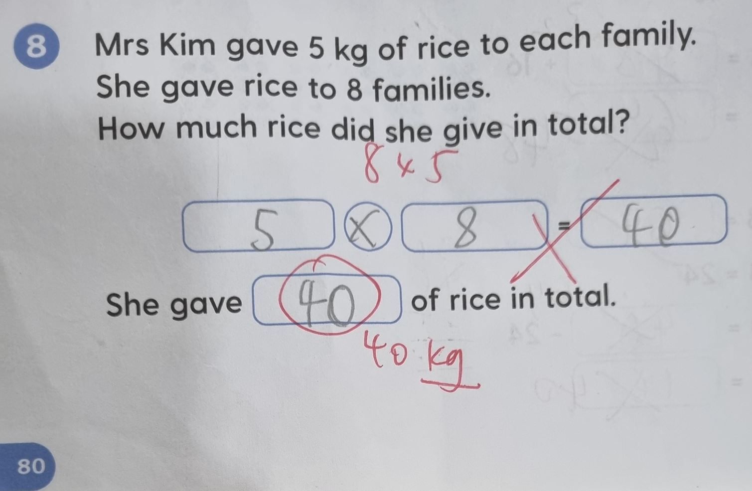 日前有網友在網路論壇「reddit」分享姪子的數學題目,只見上面寫著「金太太要給每個家庭5公斤白米,總共給了8戶家庭,請問她總共給了多少白米?」姪子在底下空格處寫「5X8=40」,沒想到竟被老師打錯。原po表示,能夠理解最後答案沒有寫上量詞是不對的,但不知道為什麼「5X8=40」是錯的,而且老師堅持要改成「8X5」才行。
