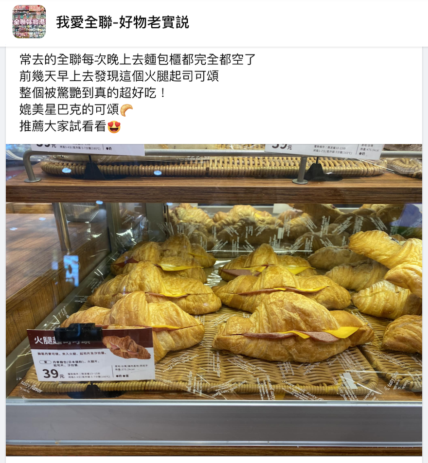 ▼原po在臉書「我愛全聯-好物老實說」發文表示,她每次晚上去超市採買,都會遺憾麵包櫃幾乎被掃光。最近她改成早上去逛,發現有一款「火腿起司可頌」,於是好奇夾一個來嚐鮮,沒想到味道超驚豔。原po分享的這款可頌售價為39元,內有火腿、起司片與沙拉醬。她吃後大讚:「真的超好吃!媲美星巴克的可頌!」