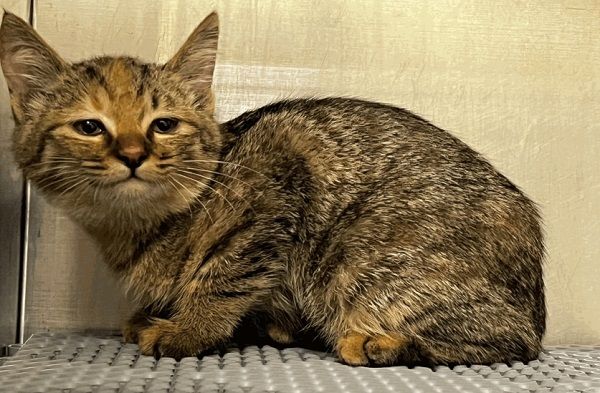 ▼桃園市動保處每天都會在官網公布當日收容的動物名單,一隻體型嬌小的黑虎斑幼貓在12月1日入園。這隻母貓是由民眾陳情捕捉,從觀音區草漯里榮工南路誘捕帶回的,動物編號為20221201-001。