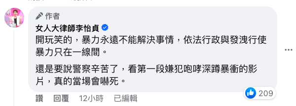 ▼後來李怡貞在留言區補充說,自己以上言論僅是開玩笑的,呼籲「暴力永遠不能解決事情,依法行政與發洩行使暴力只在一線間」。她表示還是要跟警察說聲辛苦了,「看第一段嫌犯咆哮深蹲暴衝的影片,真的當場會嚇死」。