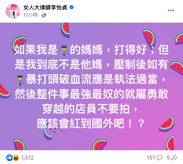 ▼李怡貞在臉書粉絲專頁「女人大律師李怡貞」發文說,如果自己是這名警察的媽媽,會認為員警「打得好」,但她不是,所以認為壓制後如有暴打頭破血流應是執法過當,並指出「整件事情最強最奴的就是就屬勇敢穿越的店員」,這名店員當時越過朱姓健美教練,做出手勢並大喊「不要拍」,阻止民眾錄影的舉動也讓李怡貞歪樓直呼「應該會紅到國外吧」?!