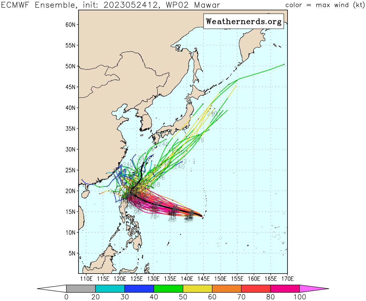 ▼吳德榮稱,最新歐洲(ECMWF)系集模式模擬圖顯示,瑪娃的系集平均路徑,大約在5至6天接近巴士海峽時,逐漸向東北大迴轉,不過有許多系集路徑分散在粗黑線的西側,其對台灣有比較大的威脅,但這是科技極限的不確定性,需要持續觀察。