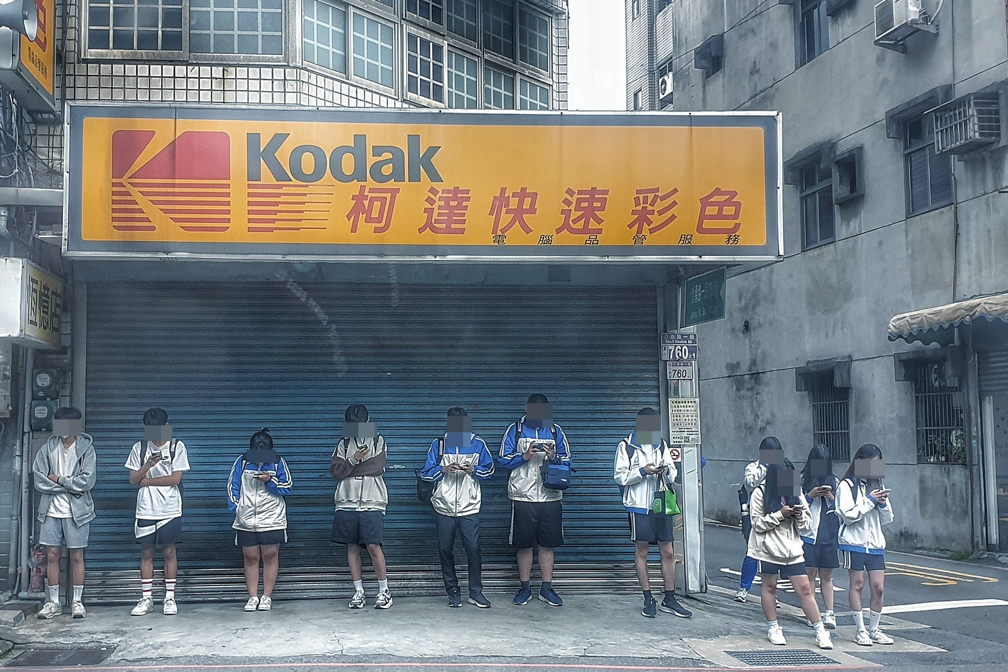 原po在臉書社團「路上觀察學院」曬出一張照片,只見11名穿著校服的學生站在一間沒營業的商店門口等車,大家排排站,都在低頭玩手機打發時間,動作非常一致。不過仔細看看就會發現,只有最左邊的男生沒在玩手機,而是雙手交叉盯著前方。