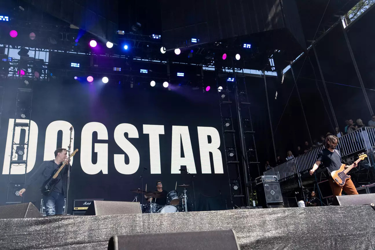 ▼Dogstar樂團由基努李維和理查德梅爾豪斯(Rob Mailhouse)於1991年合組,基努擔任貝斯手,理查德梅爾豪斯擔任鼓手,原本的吉他手因故退團後,1994年由布萊特唐蘿斯擔任吉他手兼主唱。1996年時Dogstar曾受邀來台演唱,2000年時該樂團還推出專輯《Happy Ending》,2003年再出單曲「Shine」,然後就暫時休團,本次在音樂祭登台是該樂團相隔20年後的首次復出表演。