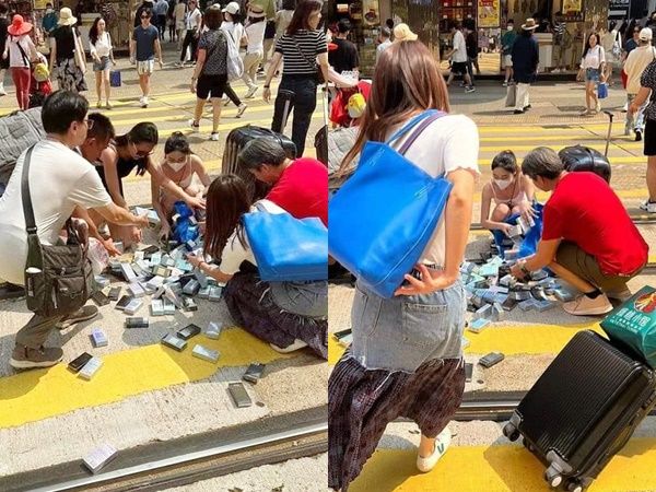 2023年05月31日近日一組有趣的照片在香港網路上瘋傳,只見一名身穿白色背心、牛仔短褲的女子在銅鑼灣怡和街過馬路時不小心摔倒,導致側背包脫落,包包內的大量保險套散落滿地。旁邊的路人看到這一幕有點尷尬,連忙上前幫忙撿起來。