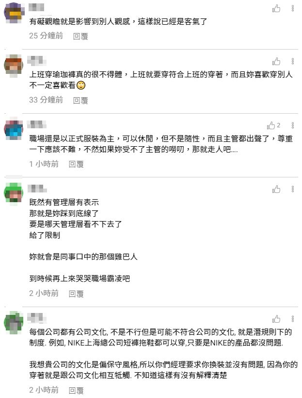 網友們看到這則貼文後幾乎一面倒直言,職場儀容很重要:「以後你的婚禮,女生都穿韻律褲、男生穿汗衫參加好了…不是古板,真的要看場合穿」、「影不影響主要看身材」、「要看企業文化吧」、「什麼場合穿什麼衣服,有人身材有點肉的,連私密處的形狀都看得出來,真的很不得體」、「早上報名游泳課,也可以直接穿比基尼去上班嗎」、「穿瑜伽褲真的很不得體,上班就要穿符合上班的穿著,而且你喜歡穿別人不一定喜歡看」。