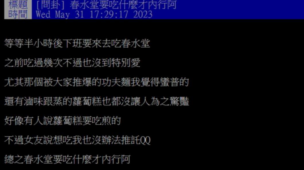 ▼原po在PTT發文說,之前吃過幾次春水堂,感覺沒有特別愛,尤其是大家推爆的功夫麵,他吃過後覺得蠻普的,滷味跟蒸的蘿蔔糕也都沒讓人為之驚豔。不過女友說想吃春水堂,他也沒辦法推託,於是詢問大家「總之春水堂要吃什麼才內行阿」?