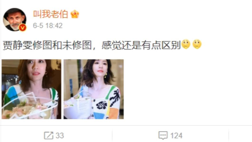 ▼日前微博上一名擁有525萬粉絲的大陸娛樂博主「叫我老伯」發文說:「賈靜雯修圖和未修圖,感覺還是有點區別。」他曬出賈靜雯精修和未修的對比照,從照片中可以看到,精修圖中賈靜雯皮膚白皙,沒有一點瑕疵;未修圖中的皮膚較暗,也能看到臉部的紋路。