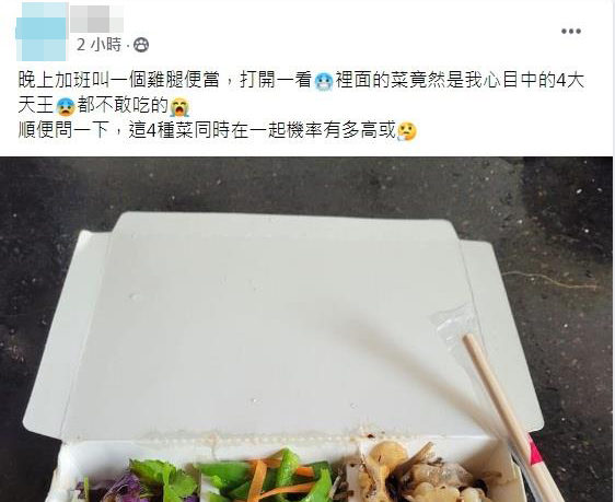 原po在臉書社團「爆廢公社二館」發文說,他晚上加班叫了一個雞腿便當,打開後發現裡面的配菜是他心目中的「四大天王」,都是他不敢吃的。從照片中可以看到,白飯上擺著滷雞腿,旁邊的4道配菜分別是紅蘿蔔、苦瓜、青椒與茄子加香菜。