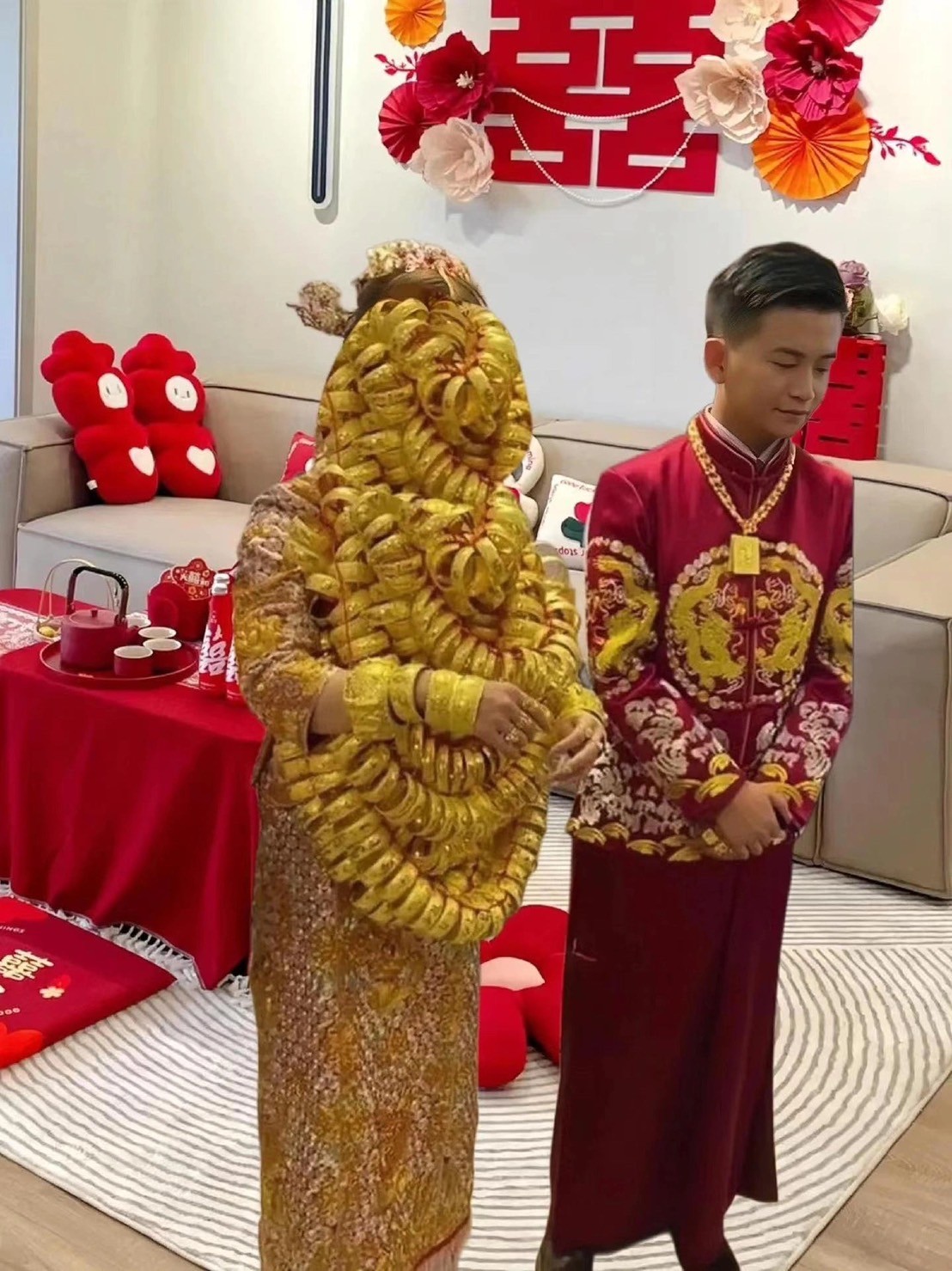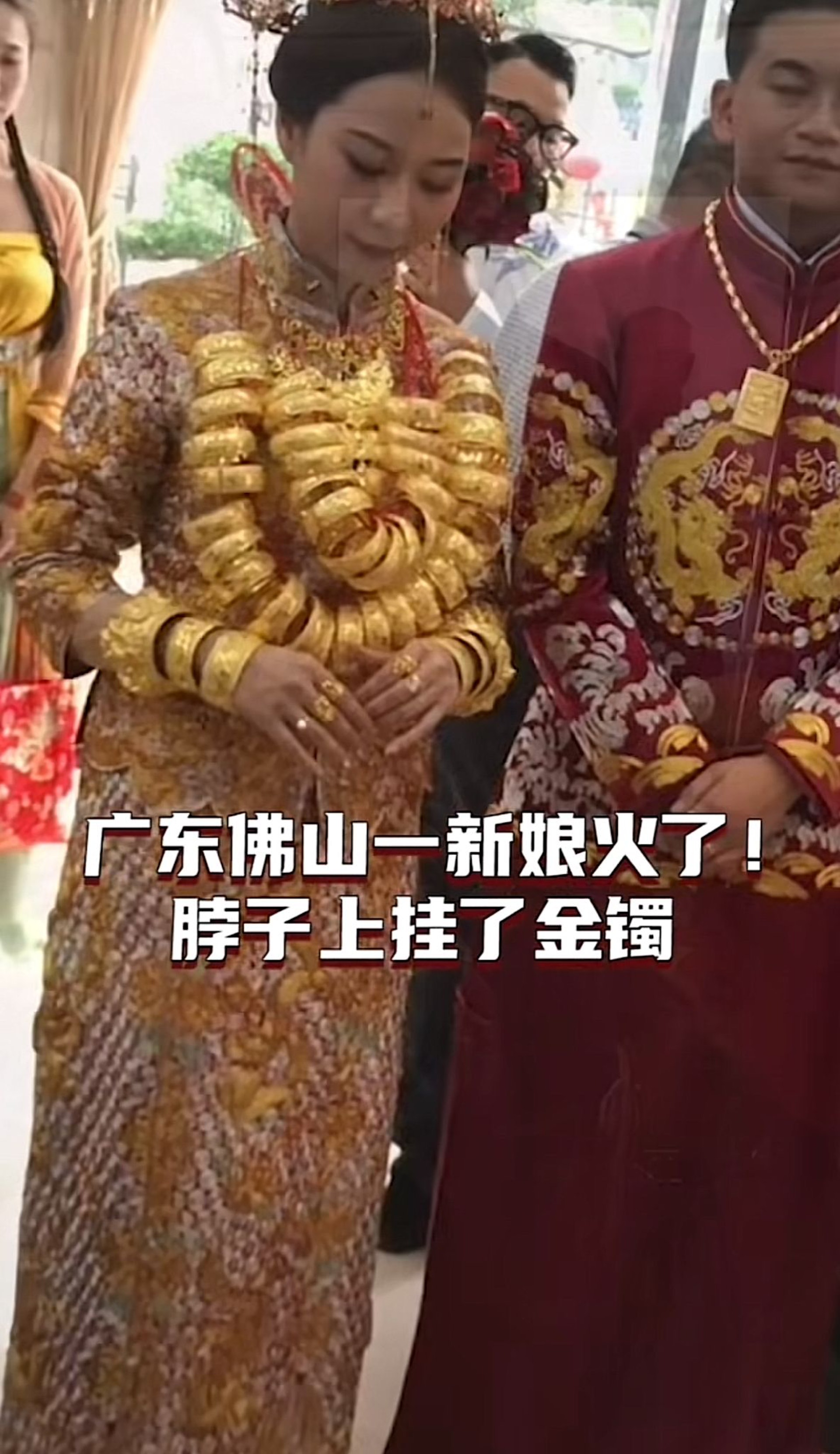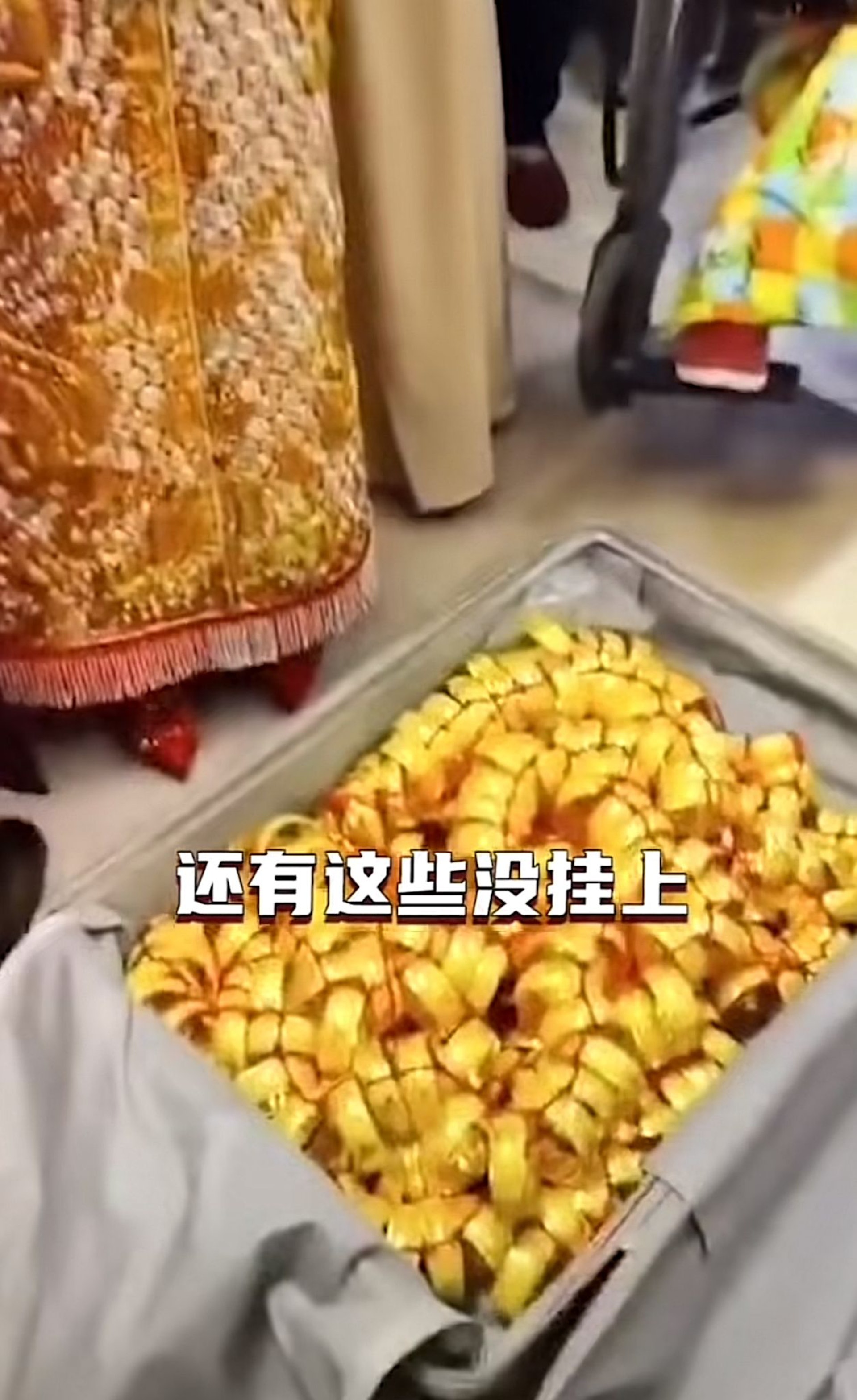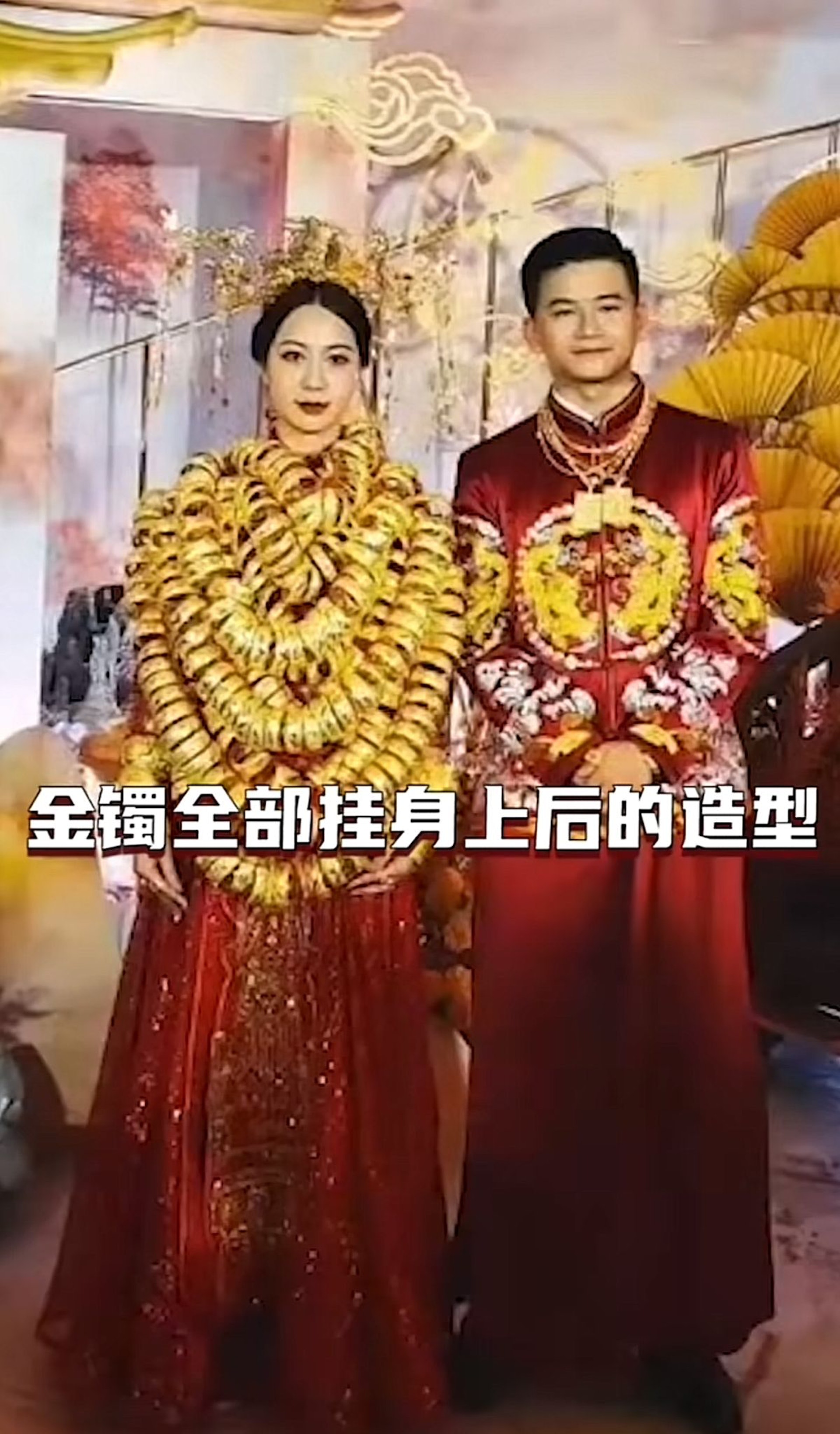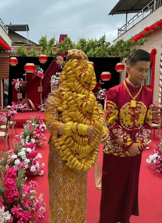 2023年06月26日很多華人父母會為要出嫁的女兒準備金項鍊、金手鐲、金戒指等金飾,希望孩子能風風光光嫁人。一般來說,新娘身上的金飾越多,說明家族財力越雄厚、父母越重視。近日一位新娘在婚禮上的模樣在網路上引發熱議,只見她身上掛滿金飾,臉都被擋住了~