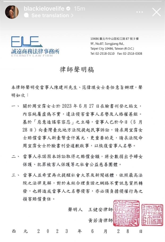 一、關於周宜霈女士於2023年6月27日在臉書刊登之貼文,內容純屬虛偽不實,違法侵害當事人名譽及人格權甚矩。基於「惡意造謠零容忍」之立場,當事人已於今日(6月28日)向台灣台北地方法院提起民事訴訟,請求周宜霈女士賠償當事人新台幣壹仟萬元,更重要的是,請求法院命周宜霈女士於臉書刊登道歉啟事,以恢復當事人名譽。