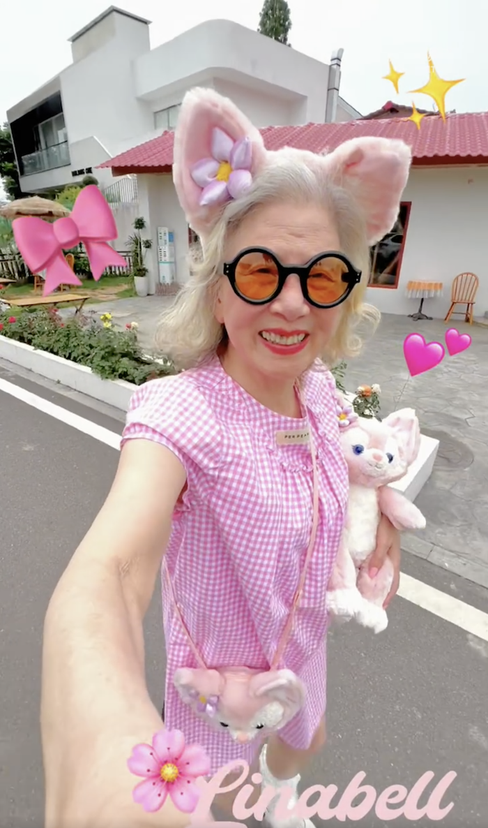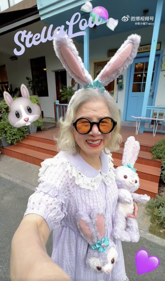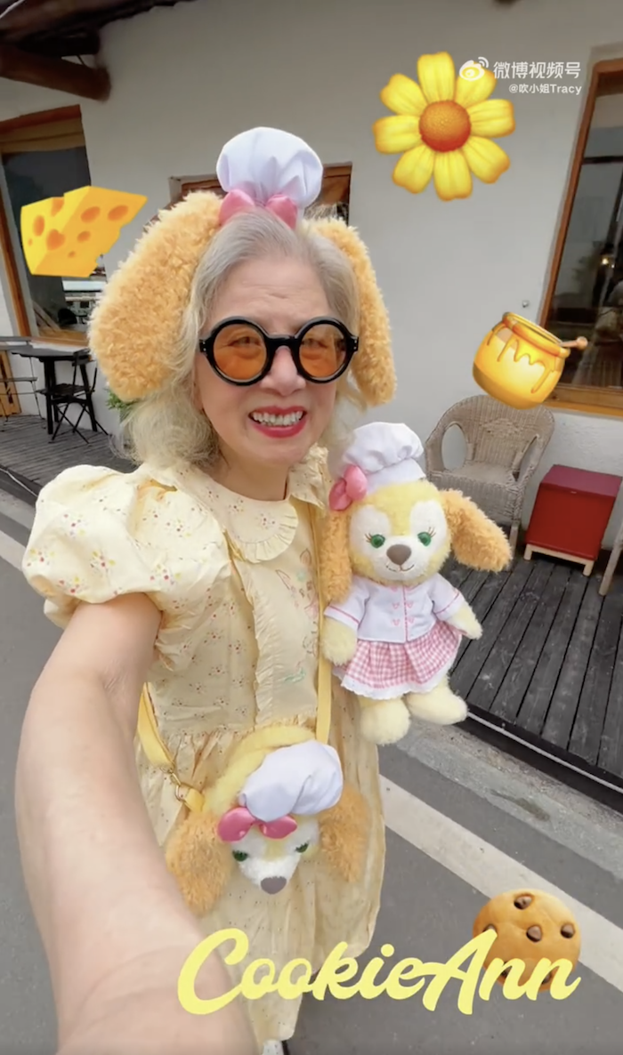 ▼阿嬤一共演繹了5套「多巴胺穿搭」,包括黃色的CookieAnn、紫色的StellaLou、粉色的LinaBell、青綠色的Olu Mel和綠色的ShellieMay,每一套穿在她身上都很可愛。她還戴上頭箍、髮飾和眼鏡,懷中抱著公仔,整體造型充滿童心。