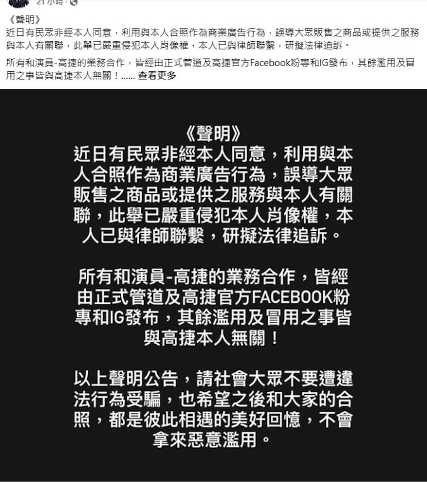 ▼因為餐廳老闆一直沒有刪除照片,所以高捷發聲明說「本人已與律師聯繫,研擬法律追訴」。直到7月4日上午,餐廳老闆終於將合照刪除,並編輯內文。他將原先po文內宣傳的套餐菜色、價格、包場人數、聯絡方式等內容刪除,只留下寒單爺和高捷出演電影《寒單》的介紹。