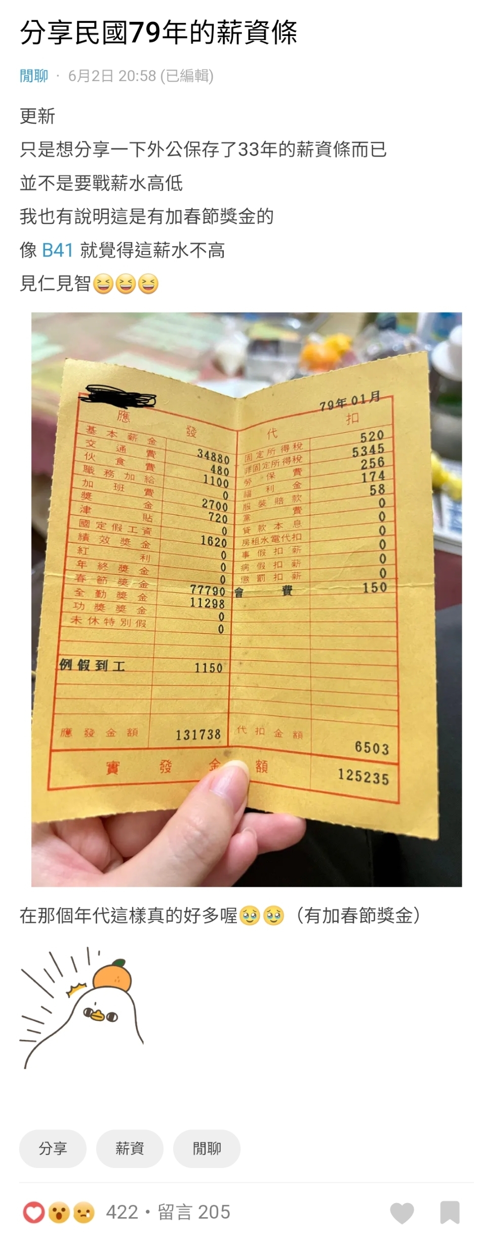 2023年07月07日近年來受到國際通膨影響,物價不斷上漲。日前有網友表示,自己在家中找到阿公33年前工作時的薪資條,包含春節年終獎金,一個月竟領了12萬5235元。網友們看到薪資條上的細項超羨慕,紛紛直呼:「現在全勤有1000就該偷笑!」