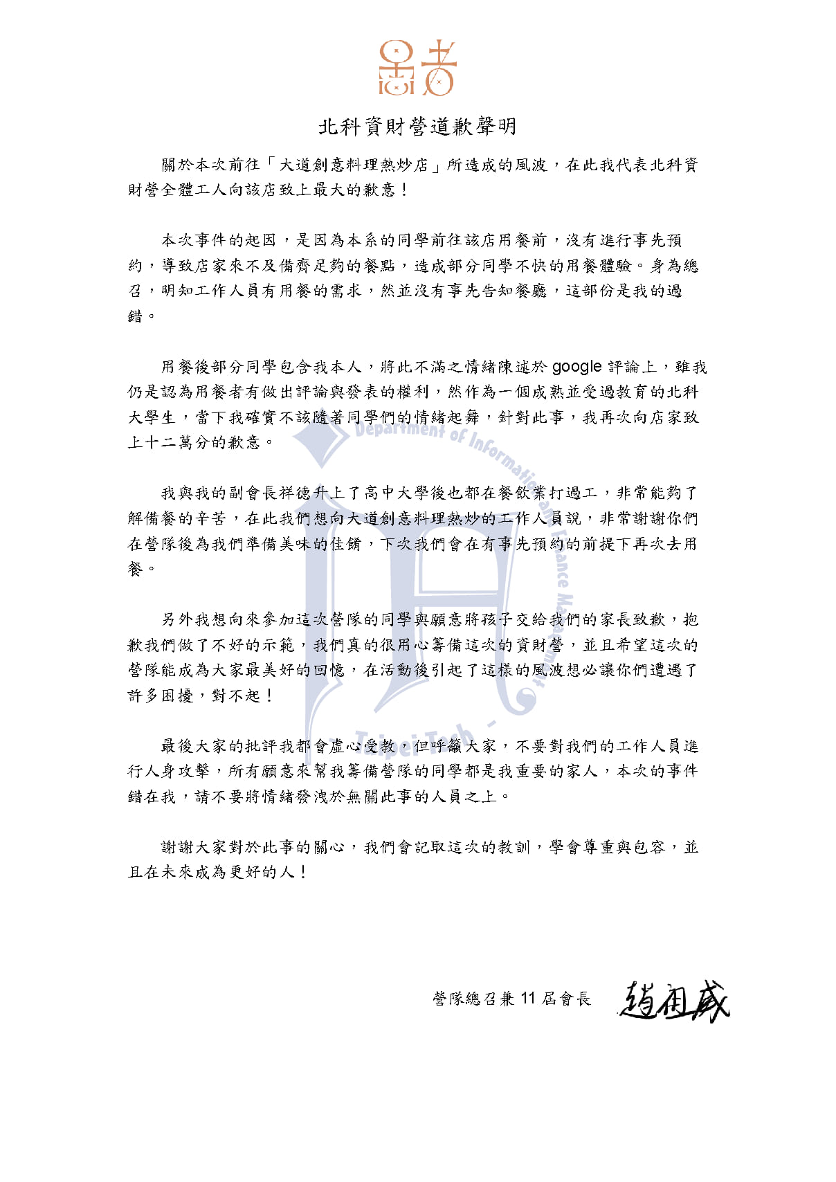 ▼「白飯之亂」引發關注後,有網友神出這群學生是「北科資財營」的工作人員。「北科資財營」總召一度發表聲明表示留下1星評價並無不妥,被網友痛批後刪文。7/9日晚,「北科資財營」到熱炒店向老闆道歉並合照,10日凌晨再發道歉聲明,表示下次會先預約再去用餐。