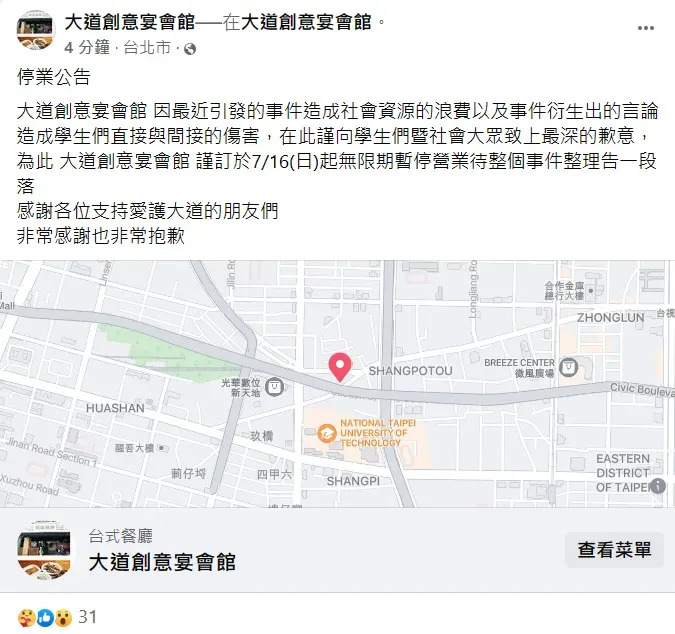 店家今天下午發出聲明,再次向學生道歉,並宣布自7/16日起無限期暫停營業,直到整件事情告一段落:「大道創意宴會館因最近引發的事件造成社會資源的浪費,以及事件衍生出的言論,造成學生們直接與間接的傷害,在此謹向學生們暨社會大眾致上最深的歉意,為此大道創意宴會館 謹訂於7/16(日)起無限期暫停營業待整個事件整理告一段落,感謝各位支持愛護大道的朋友們,非常感謝也非常抱歉。」