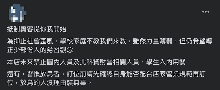 ▼該日式料理店在臉書粉專發文說:「抵制奧客從你我開始,為抑止社會歪風,學校、家庭不教,我們來教,雖然力量薄弱,但仍希望導正少部分人的劣習觀念。本店未來將禁止北科資財營相關人員、學生入內用餐,習慣放鳥者,訂位前請先確認自身能否配合店家營業規範,放鳥的人沒有理由裝無辜。」
