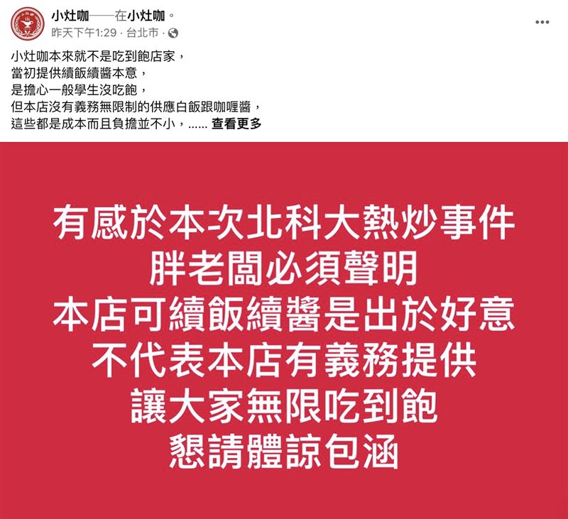▼「小灶咖」臉書粉專表示,本來就不是吃到飽店家,當初提供續飯續醬本意,是擔心一般學生沒吃飽,「但本店沒有義務無限制的供應白飯跟咖喱醬」,這些都是成本而且負擔並不小,尤其現在通膨很嚴重,小店真的很難經營,因此未來會以現場狀況來提供,「如果因為這樣的聲明造成不快,請可以不用來本店消費,避免引發兩造不愉快」。