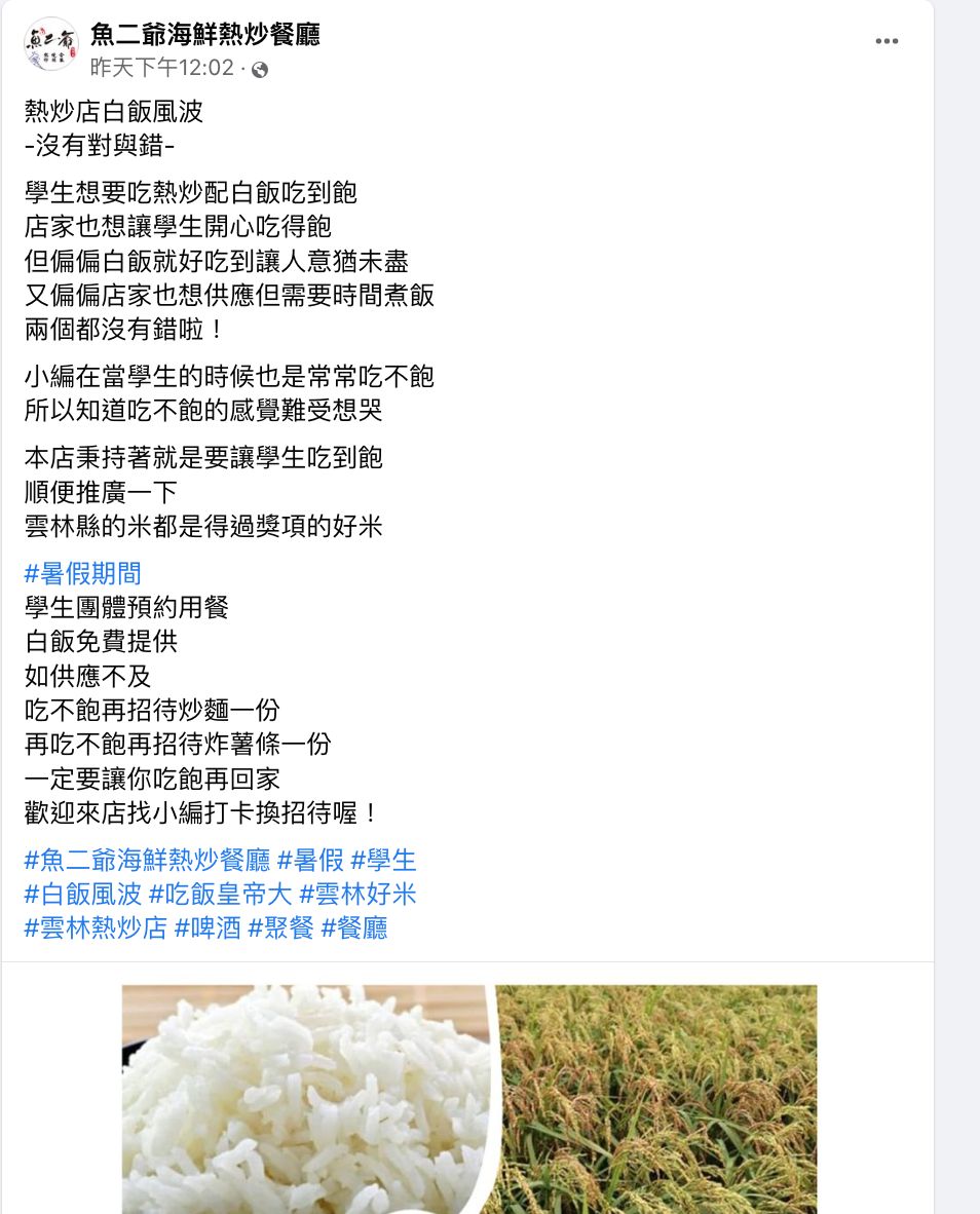 ▼「斗六市魚二爺海鮮熱炒餐廳」在官方臉書貼文說:「熱炒店白飯風波沒有對與錯,學生想要吃熱炒配白飯吃到飽,店家也想讓學生開心吃得飽,但偏偏白飯就好吃到讓人意猶未盡,又偏偏店家也想供應但需要時間煮飯,兩個都沒有錯啦!」