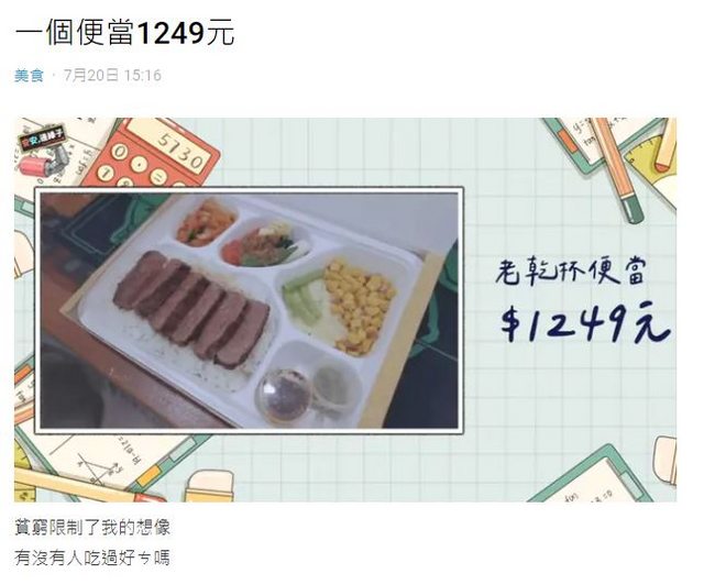 ▼原po不禁直呼:「貧窮限制了我的想像,有沒有人吃過?好吃嗎?」照片曝光後,網友們紛紛驚呆,留言說:「129可以接受」、「看到配菜笑出來」、「也許它的長跟寬是100×120,這樣就還行」、「1249配菜玉米」、「我吃過1280的便當,其中1200是罰單」、「1249不如去吃buffet」。
