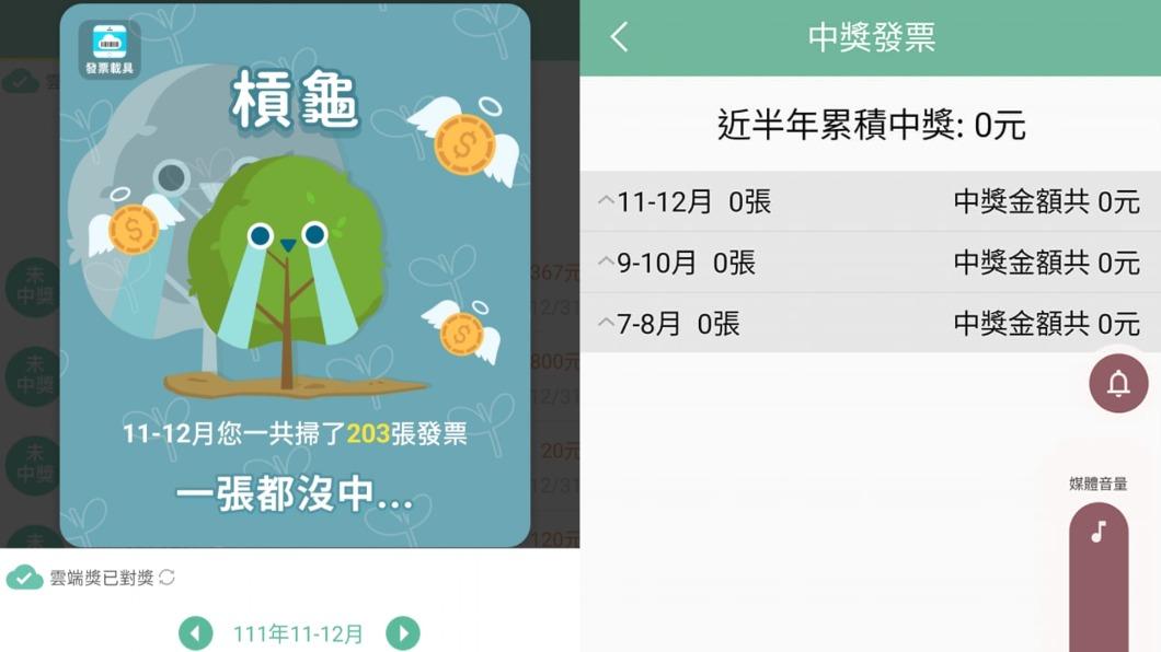 ▼原po在臉書社團「爆廢公社」發文說:「自從用了載具之後發票更難中了,以前手動對發票,每一期至少也會中一張200元。」從原po分享的載具APP「槓龜」畫面可以看到,他11至12月掃了203張發票,消費總金額達145615元,但1張都沒有中獎。