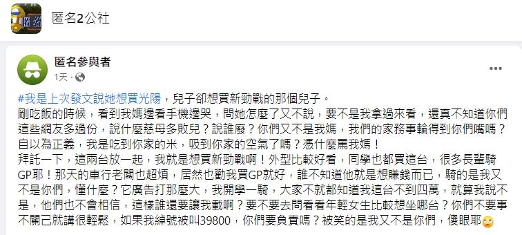 2023年08月17日先前一名人母在臉書社團發文說,她經濟能力有限,打算給大一的兒子買一台萬元有找的光陽GP125,但兒子當場變臉拒絕,堅持要買一台10萬的新勁戰,還嗆媽媽「就只會買便宜的給我」,這讓原po自責又難受。網友們看到後紛紛表示「寶媽造就媽寶,這完全是因果關係」、「果然慈母多敗兒」。這名兒子不滿網友們的說法,竟發文正面回擊。