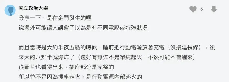 ▼有事件的相關人士澄清說,業者說的「海外」,其實是在「金門」,希望避免讓人誤以為是有不同電壓或特別狀況。並補充說「當時是大約半夜五點的時候,睡前把行動電源放著充電(沒接延長線),後來大約八點半就爆炸(還好有爆炸不是單純起火,不然可能不會醒來),從圖片也看得出來,插座部分是完整的,所以並不是因為插座走火,是行動電源內部起火的。」