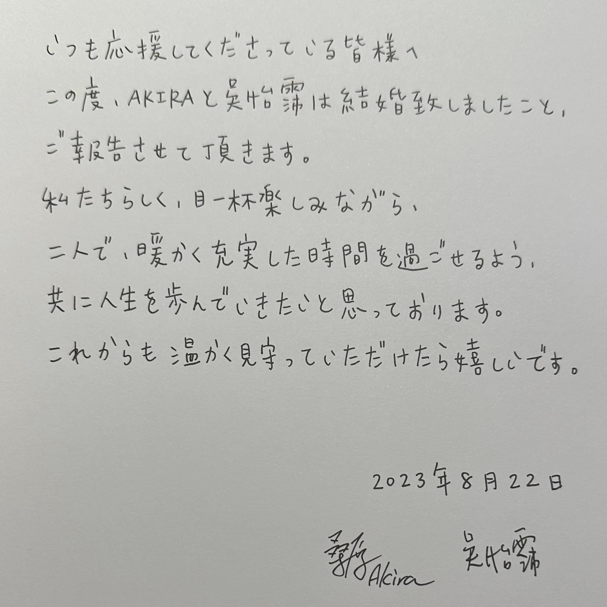 吳怡霈透過經紀人感謝大家的祝福,「如同文章所說,步入人生另一個身分」。目前她與AKIRA已經在日本東京登記結婚,關於正式婚期、蜜月、定居何處等事都還沒有確定。在台灣教日文的AKIRA將會繼續教書工作,經紀人也否認吳怡霈已經懷孕,「未來有任何新的規劃和消息,會再跟大家通知。」