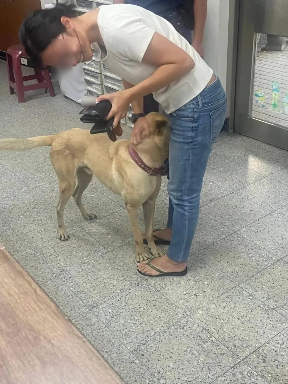 ▼老闆見狗狗佩戴項圈,應該是有人飼養的,於是報案希望警方協助尋找飼主。員警獲報趕往,研判可能是有人飼養的狗狗找不到回家的路,於是將狗狗帶到動物醫院掃描晶片,並透過晶片資料查詢到27歲林姓女飼主的聯絡電話,聯繫對方前來所內認領。