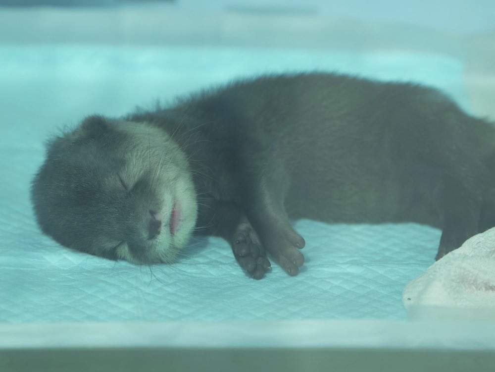 ▼水獺寶寶緊閉雙眼,手手騰空,看起來就像一個柔軟的玩偶。牠睡得太香甜,竟微微張開嘴巴、露出粉嫩的舌頭,睡姿實在太呆萌,讓人只看就覺得平靜、療癒,好想抱緊處理。