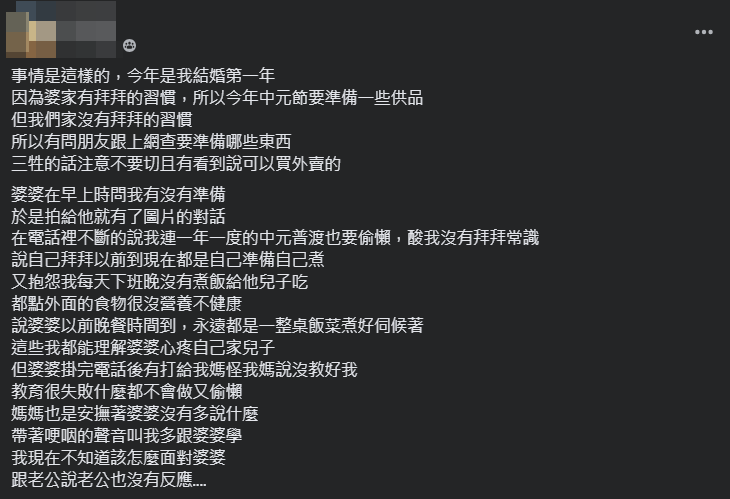 婆婆在電話中不斷酸原po一年一度的中元普渡都要偷懶、沒有拜拜常識,還說過去中元節都是自己準備、自己煮,甚至提到媳婦每天下班晚沒有煮飯給兒子吃,外食沒營養又不健康,「以前晚餐時間到,永遠都是一整桌飯菜煮好伺候著」。