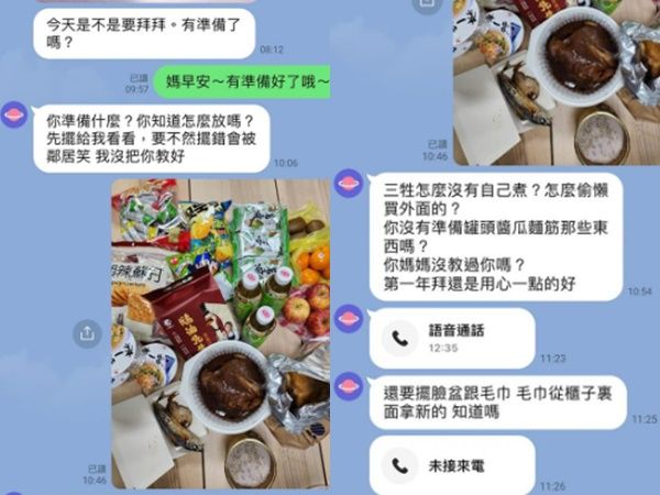 原po在臉書社團「爆怨公社」發文說,她知道婆家有拜拜的習慣,因此提前問朋友、上網查資料後準備了一堆供品,但婆婆卻傳訊息質問她「妳準備甚麼?妳知道怎麼放嗎?先擺給我看看,要不然擺錯會被鄰居笑我沒把妳教好」。