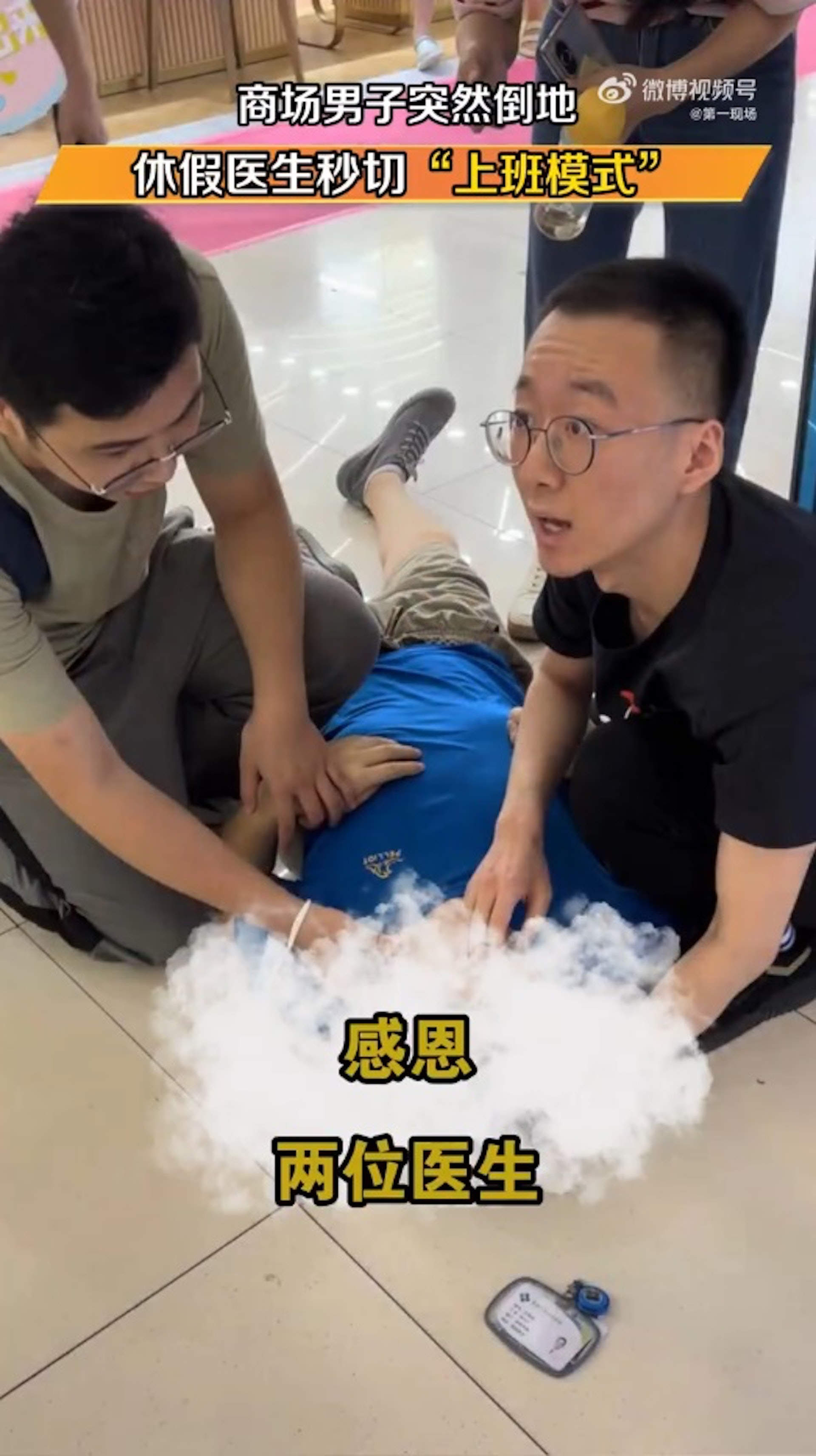 2023年09月06日日前中國大陸深圳一名50多歲的男子獨自逛商場時突然倒地昏迷,路人們發現後立刻伸出援手,並大喊「有人暈倒啦」!聽見呼救聲,正在休假的香港大學深圳醫院外科醫生王銘池和陳梟立即上前搶救,因為他們在黃金時間內進行施救,才將男子從死神手中救回來。