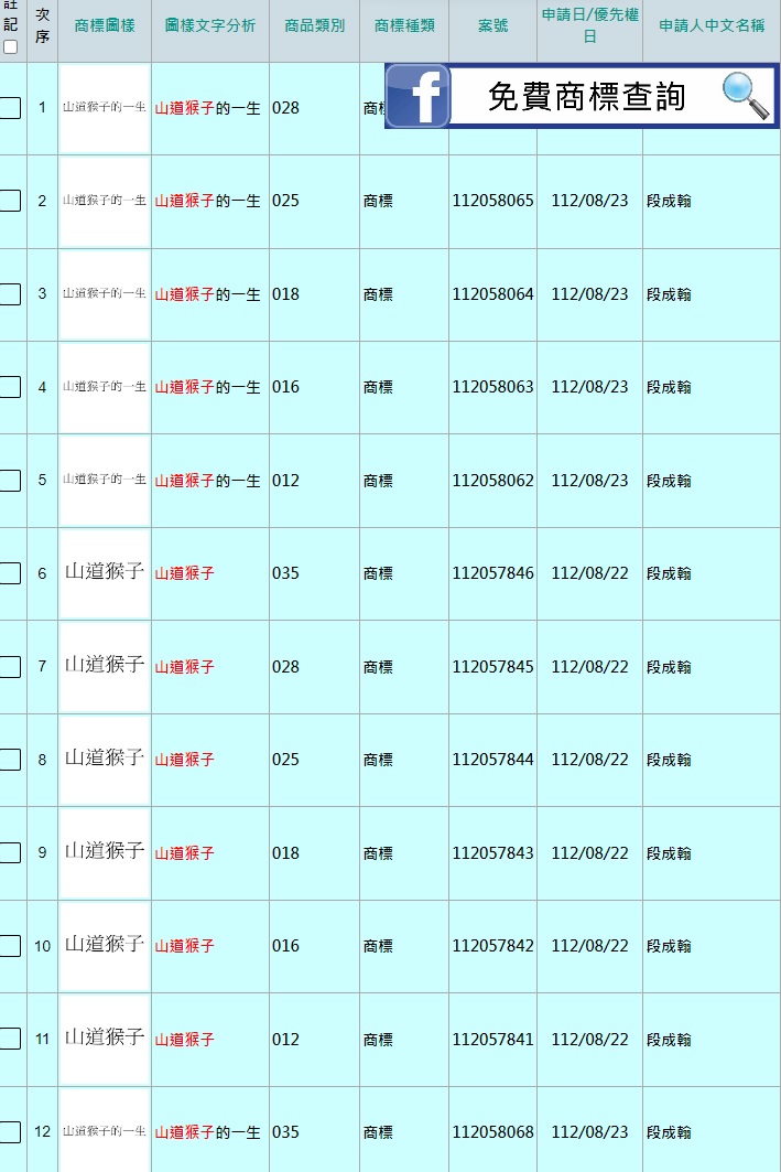 ▼「免費商標查詢」同時提醒說,二創其實還是有著作權保護,但商標權要主動向智財局申請才有專用。此外,商標授權的前提是要有權利,從商標申請範圍就可以看出來申請人想要開發的商品服務或是和廠商聯名推出周邊商品。如果接下來其他粉專或品牌商想要用「山道猴子的一生」名字來宣傳商品服務,建議應取得Eric Duan授權,以免侵權問題。