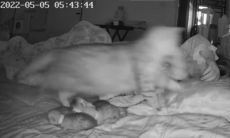 ▼從影片中可以看到,凌晨5點多,主人正躺在床上熟睡,貓咪突然跳上床,將口中的奶貓放在主人的枕頭上方。牠放好後就跳了下去,主人被吵醒時還不清醒,害怕睡昏頭壓到奶貓,只好把奶貓放到旁邊,醒來查看影片時才明白發生了什麼事。