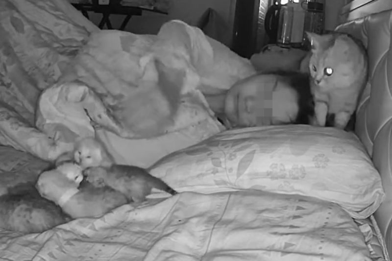 ▼主人將這段影片上傳到抖音,並說:「自從我家貓生寶寶後,牠每天早上五點多就會把寶寶叼過來叫我看著,牠自己卻在一旁睡覺。」主人還開玩笑表示:「你們說牠不用上班,幹嘛不能自己好好看著寶寶,非得讓我幫牠帶。」