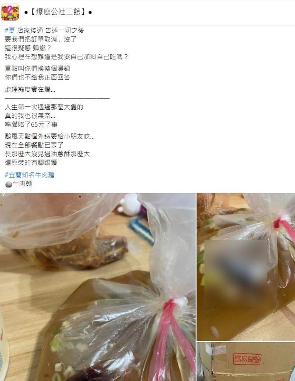 ▼原po在臉書社團「爆廢公社二館」發文說,因為是颱風天,所以他特別透過外送平台點了一間「知名牛肉麵」的餐點,希望能讓孩子們在家享用美食。就在一家人興高采烈地大吃一頓後,原po意外發現湯包裡竟漂浮著一隻超大的蟑螂!