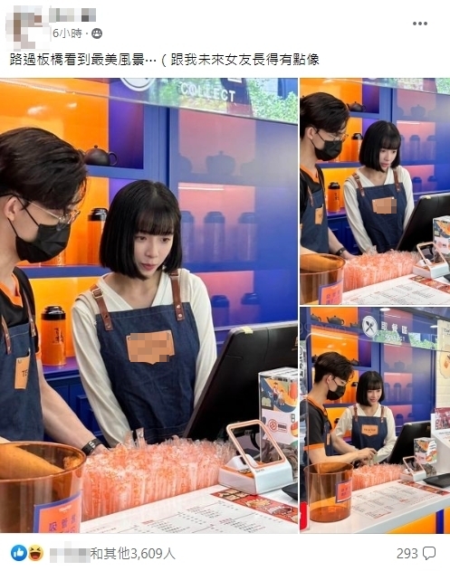 2023年09月05日日前新北市一名男子路過某間手搖飲店,發現一名正妹店員長得十分出眾。他忍不住拍下女店員的模樣並po到臉書社團,表示這是「路過板橋看到最美風景」,還笑稱「跟我未來女友長得有點像」。這則貼文迅速引發討論,女店員的身分很快也被網友神出。