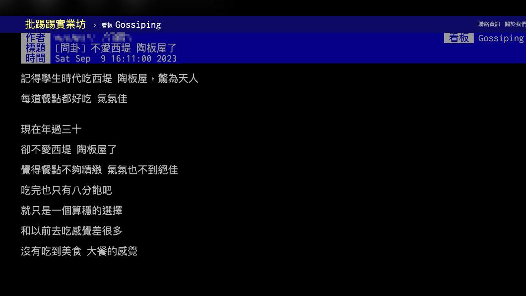 ▼原po在PTT發文說,學生時期去「西堤牛排」與「陶板屋」用餐時,被其餐點的口味與用餐氛圍深深打動,然而隨著年齡增長,現已逾30歲的他發現,這兩家餐廳的餐點不如過去精緻,氛圍也失去當初的吸引力。他表示「吃完也只有八分飽吧,就只是一個算穩的選擇」,已經沒有吃大餐的感覺,於是好奇問大家:「是這兩間不行了,還是我嘴巴變刁了?」