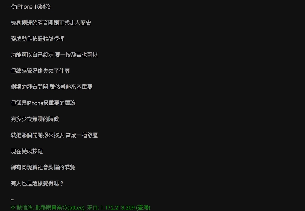 ▼這名網友在PTT的iOS板上以「靜音模式開關沒了…好像失去什麼」為題發文,表示iPhone 15 Pro將側邊的靜音開關更換為動作按鈕,雖然這一設計不錯,動作按鈕也能自行設定,但卻好像失去了什麼。原po認為「靜音開關」堪稱iPhone最重要的靈魂,他無聊時便會去撥動開關,如今變成按鈕,有種對現實妥協的感覺,有沒有人也這麼覺得?