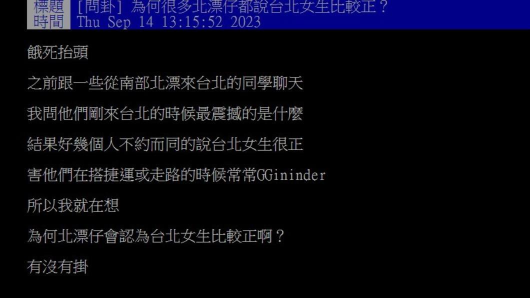 ▼原po在PTT上以「為何很多北漂仔都説台北女生比較正?」為標題發文說,他和北漂的同學聊到「來台北最震撼的是什麽」,沒想到好幾個人都覺得是「台北女生很正」,坦言在搭捷運或走路時,甚至會不自覺出現生理反應。原po對此很不解,於是發文詢問原因。