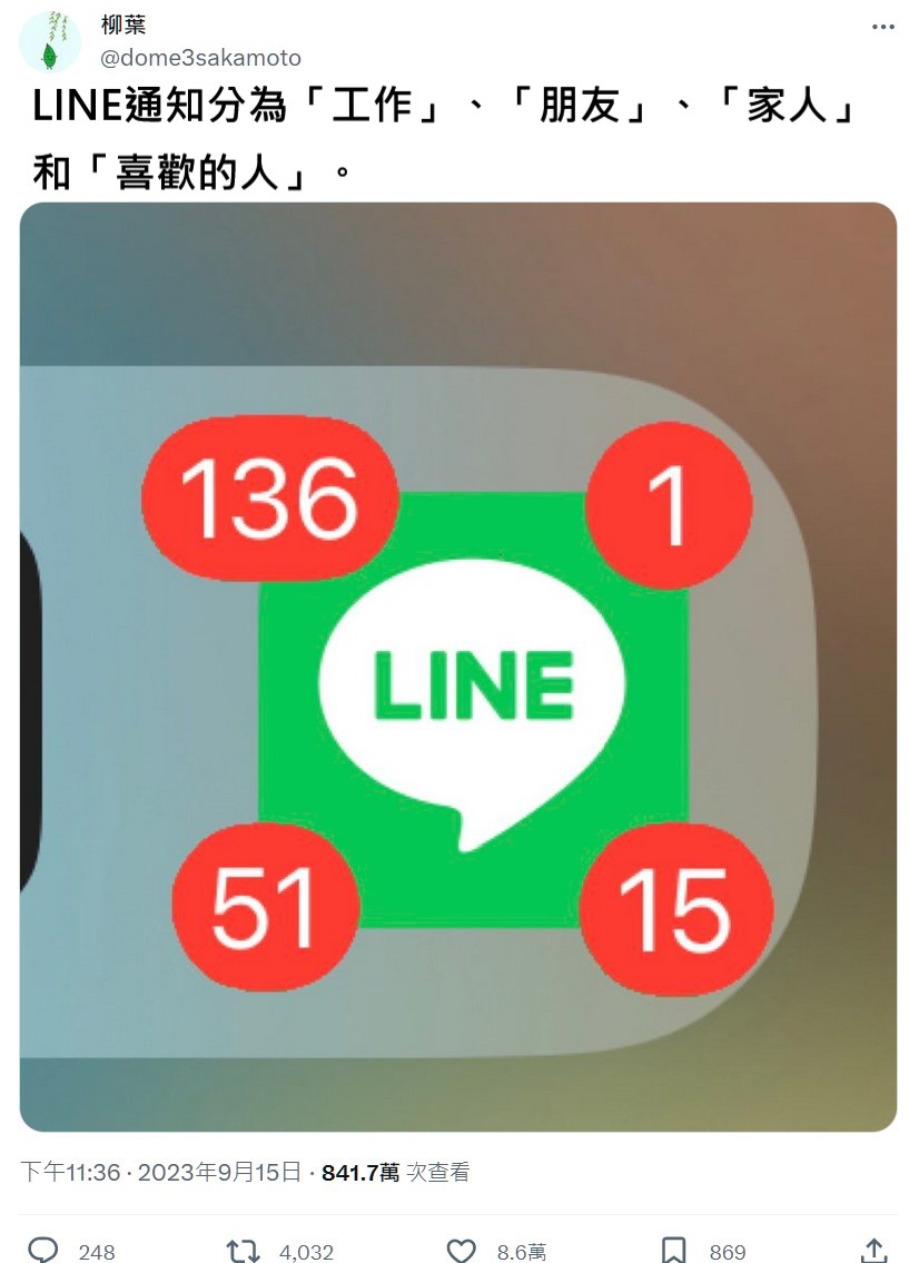 ▼魚漿夫婦分享一位網友的貼文,只見該網友的LINE應用程式圖示的四個角落都顯示了不同的未讀訊息數量,分別為136、1、51和15。原來這位網友希望LINE未來能推出新功能,將未讀訊息依「工作」、「朋友」、「家人」和「喜歡的人」進行分類,如此就可以一眼看出哪些訊息最需優先回覆。