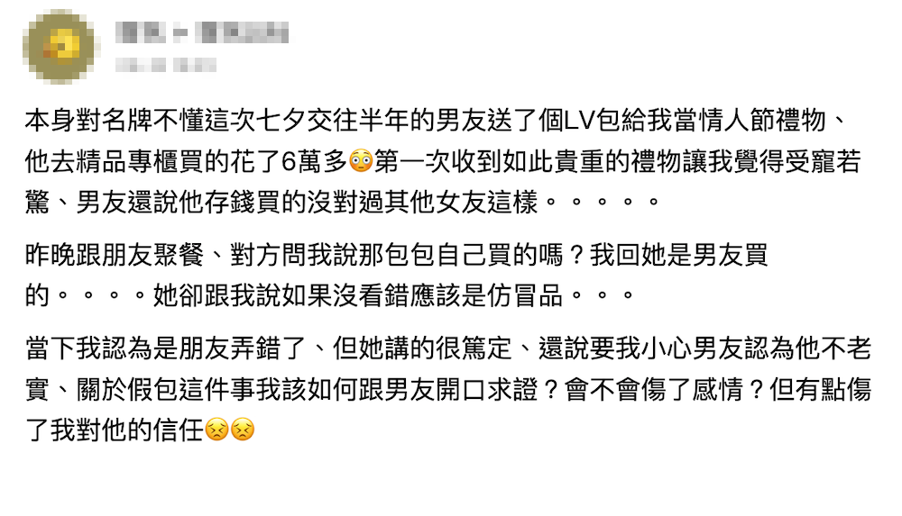 原po在臉書社團「匿名公社」發文說,她與男友交往半年,今年七夕男友送給她一個LV包當作情人節禮物。男友說這是他在精品專櫃花6萬多元買的,還說這份禮物是他存錢買的,他從沒為其他女友做過這樣的事。原po第一次收到如此貴重的禮物,感覺受寵若驚。