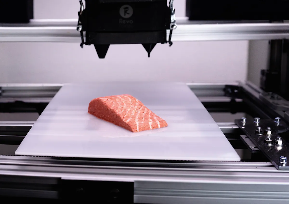2023年09月20日最近奧地利新創公司Revo Foods研發的3D列印純素鮭魚「THE FILET – Inspired By Salmon」陸續在當地超商上架。這可能是首款進入超商銷售的3D列印食品。該公司的首席執行官Robin Simsa在一份聲明說:「隨著工業級3D食品列印技術的出現,我們正在進入一個食品革命的新時代,這一時代的食品可以完全根據消費者的需求進行製作。」