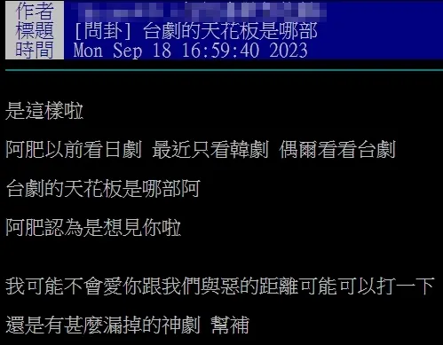 2023年09月20日近年來台劇題材越來越多元化,不僅有經典的愛情與鄉土劇,更有深入探討社會議題、引人深思的新作,令大眾眼前一亮。日前一名網友在PTT發文說,自己以前喜歡看日劇,後來換口味改看韓劇,偶爾看看台劇。原po非常好奇大家心目中的「台劇天花板」是哪一部?