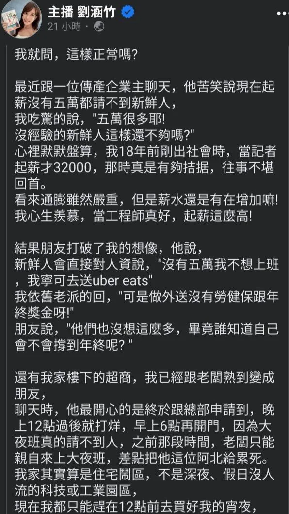 2023年09月22日近年來,隨著物價持續上升,薪水的增長速度卻未跟上步伐。近日知名女主播劉涵竹在臉書發文說,她與某傳產企業老闆交談時得知,「現在起薪沒有5萬,都請不到社會新鮮人」。年輕人寧願選擇當外送員,也不想在辦公室中打拼。這一現象讓她不禁感嘆:「社會變了!」