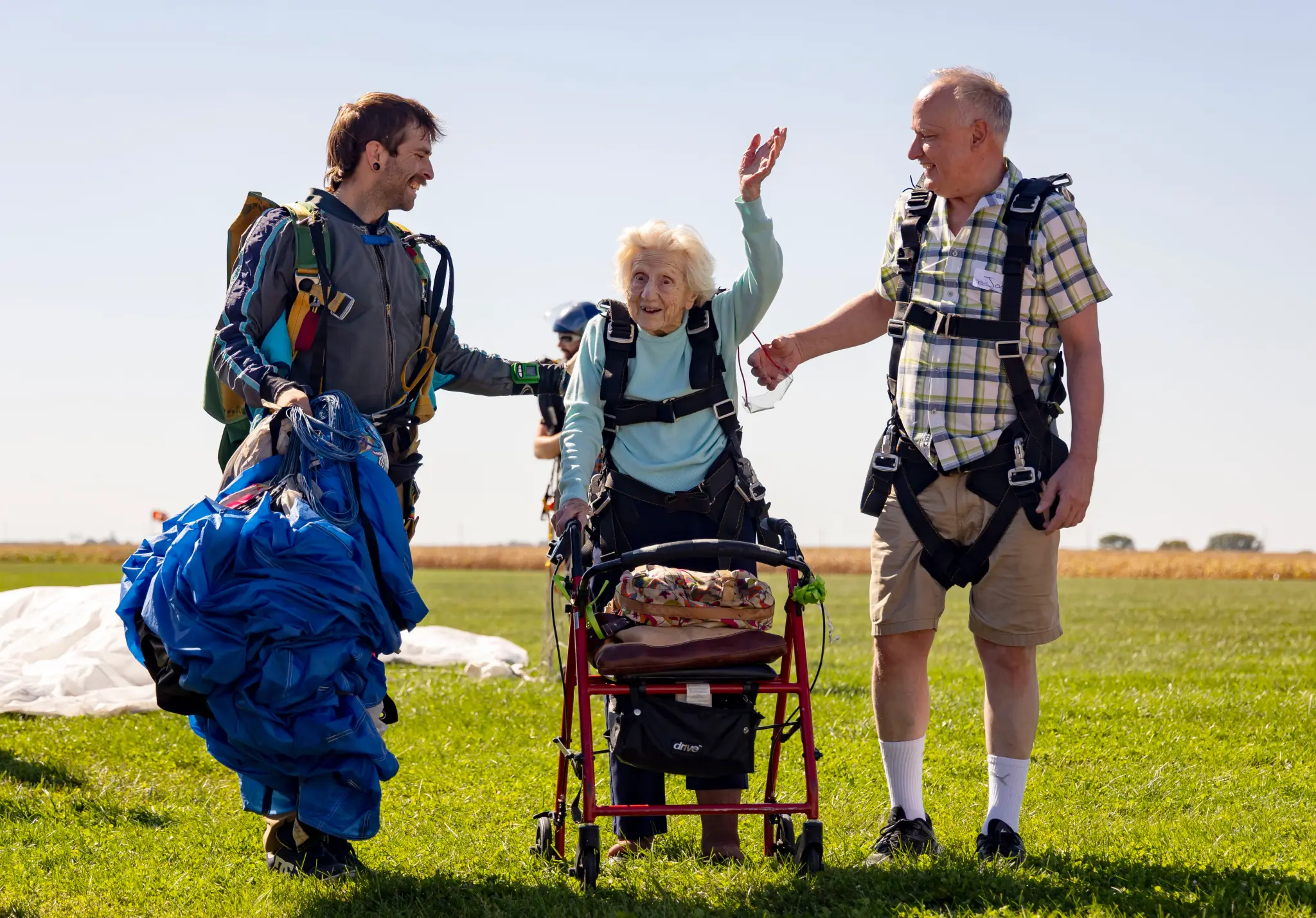 ▼值得一提的是,Hoffner於10月1日在教練的協助下,從1萬3500英尺(約4100公尺)的高空中一躍而下,經過大約7分鐘的自由落體後成功著陸,全程都受到觀眾的熱烈掌聲與歡呼。她的這次驚險之舉不僅打破了世界最高齡跳傘者的紀錄,且正在進行金氏世界紀錄的申請。