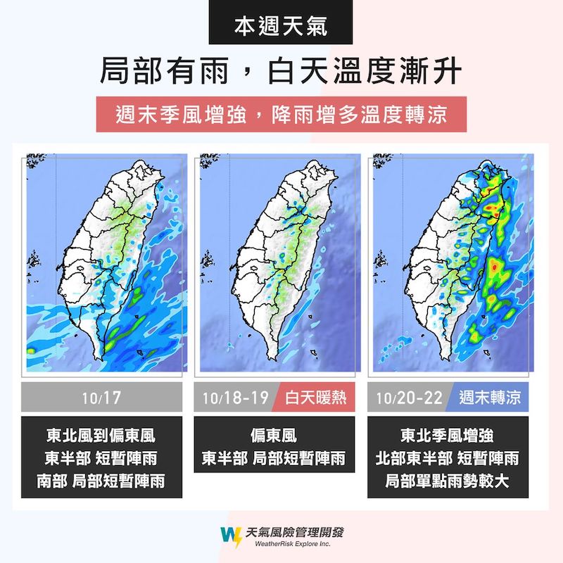 天氣風險公司分析,本週的天氣大概可以分成前、後2個不同段落,今天到週四(19日)東北季風逐漸減弱,風向轉為偏東風,降雨不多,大致以東半部、恆春半島為主。不過巴士海峽有雲層靠近,南部地區也會有些局部短暫陣雨機會,但預報雨勢都不大,中北部地區大致多雲到晴、降雨機會低。溫度則因為季風減弱而逐漸回升。