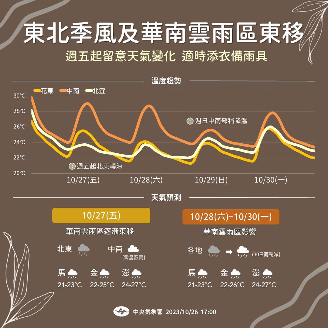 2023年10月27日隨著北方大陸高壓前緣南下,昨晚(26日)東北季風已經加強,帶來了北方的較涼氣流。中層水氣雲雨帶自大陸向南推進,目前已覆蓋中北部。雖然目前降雨的狀況還不多,但預計今日(27日)將開始出現雨勢,其中東北角、宜蘭到花蓮一帶局部的雨量將會較為集中。