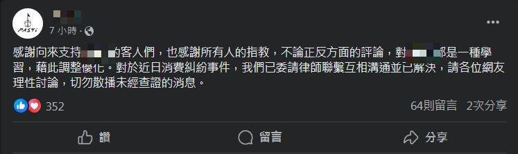 事隔9天,該業者終於在臉書上作出回應,表示感謝公眾的意見與批評,這些反饋對餐廳是一種學習和成長的機會。關於消費爭議事件,業者強調已經與當事人通過律師進行了協商並解決了問題。最後,他們呼籲網友保持理性的討論,並避免散播未經查證的消息。